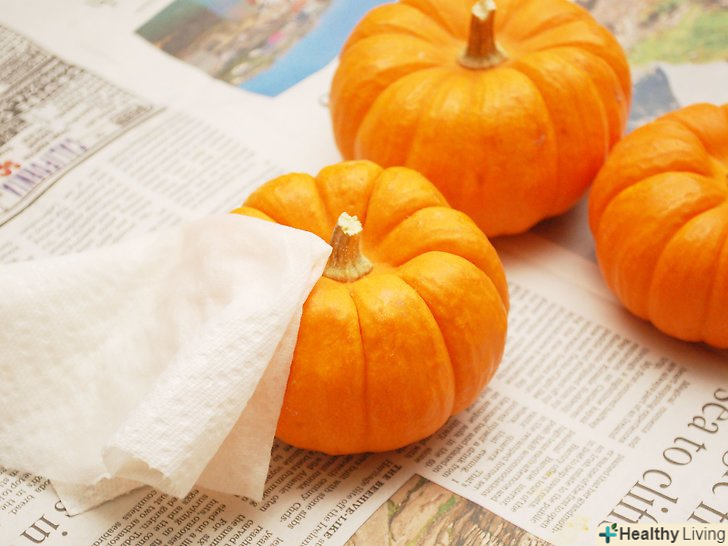 Помийте і обсушити гарбуз. акуратно видаліть бруд, використовуючи вологі серветки і змочену Туалетний папір, і витріть гарбуз паперовим рушником або серветкою. Не використовуйте жорсткі щітки, щоб не пошкодити поверхню гарбуза, подряпавши її.- Намагайтеся на намочити корінець або низ гарбуза, це викликає гниття.