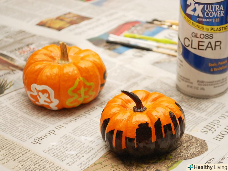 Нанесіть герметик (за бажанням). Герметик наносити необов'язково, проте фарба на нього краще лягає. Ви можете купити герметик для виробів в магазині товарів для творчості та рукоділля. Він доступний у вигляді аерозолів і в банках, на ваш розсуд.- За допомогою кисті нанесіть герметик на всю поверхню гарбуза і дайте обсохнути. Ретельно промийте кисть, якщо ви плануєте наносити фарбу нею ж.