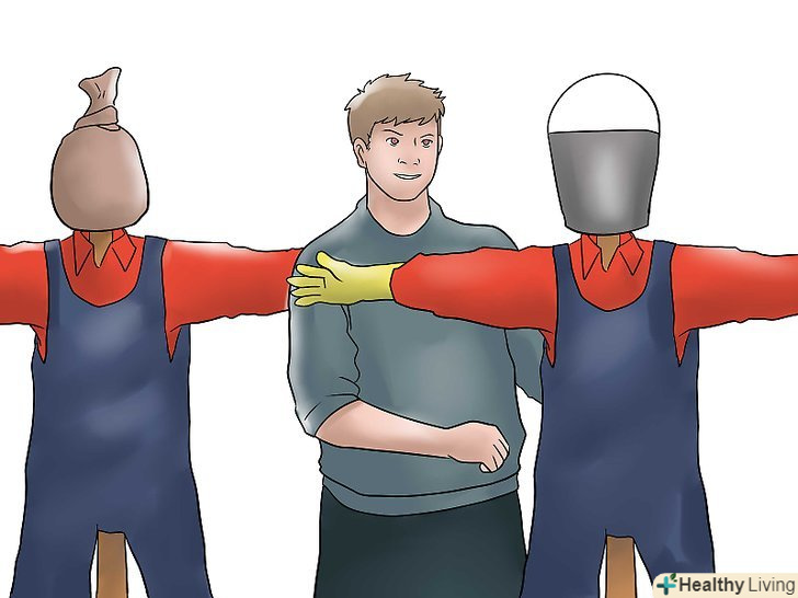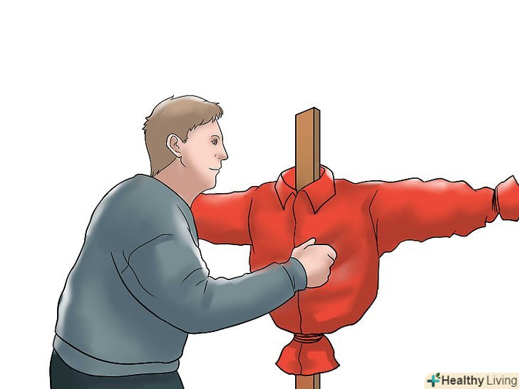 Зберіть остов. закріпіть 150 см палицю у верхній частині 180-240 сантиметрової палиці, ручки від граблів і т.д. це будуть плечі лякала. Закріпіть коротку палицю за допомогою болта, шпагату або гарячого клею. [1]