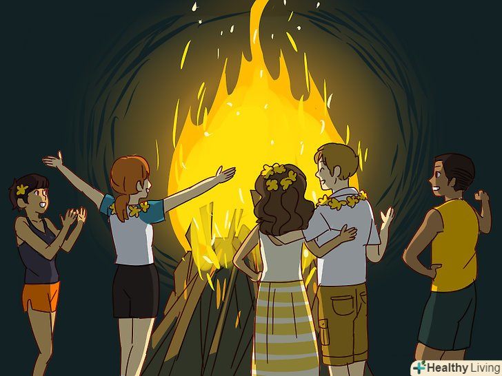 Проведіть вечірку біля багаття. багаття — це традиційний атрибут дня літнього сонцестояння. Вогонь завжди забезпечував людині захист, відлякував реальних і міфічних нічних істот. Сьогодні багаття стане прекрасним приводом влаштувати вечірку для друзів. [12]- Виберіть безпечне місце, в якому можна розводити багаття. Переконайтеся, що багаття не заборонені через сухі погодні умови.