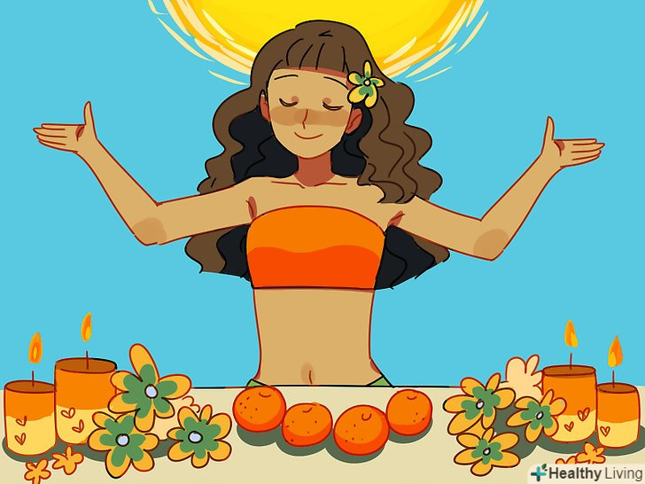 Почитайте Сонце. літнє сонцестояння-чудовий момент, щоб висловити свою повагу сонцю. Можна приготувати святковий сонячний чай : додайте в чашку з водою їстівні квіти і трави, а потім дайте напою настоятися на сонці. Ще можна зробити сонячну мандалу з пелюсток помаранчевих і жовтих квітів. Розташуйте всі пелюстки круговими декоративними візерунками, які будуть висловлювати вашу безтурботність і спокій. [2]