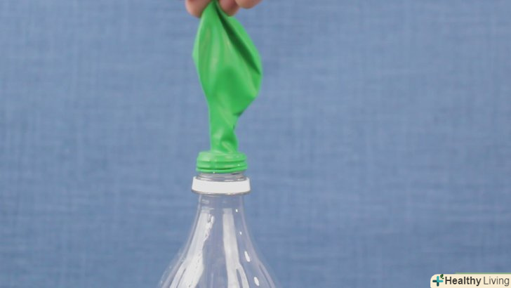 - Надіньте на шийку пляшки кільце кульки. щільно натягніть на пляшку хвостик кульки. Іншу частину кульки можна звісити набік, так щоб знаходиться в ньому харчова сода поки не потрапила в пляшку. [13]