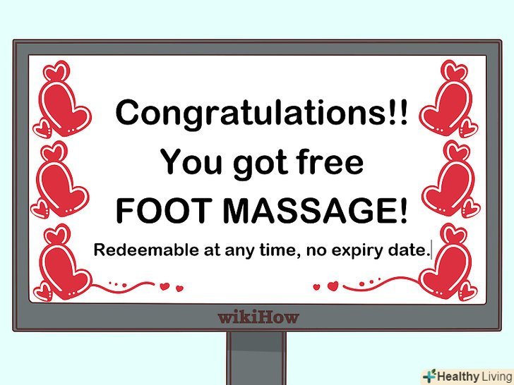 Подаруйте коханій людині подарунковий сертифікат на свої послуги. він може включати в себе масаж ніг, один тиждень готування або миття посуду без будь-яких прохань або обіцянку чогось особливого, що ваша друга половинка завжди хотіла здійснити в ліжку. [3]- Створіть сертифікати самостійно на комп'ютері. Можна використовувати шаблон візитної картки або просто роздрукувати сертифікати і вирізати їх у формі серця. В якості милого штриха напишіть на них:»можна використовувати в будь-який час без терміну придатності".