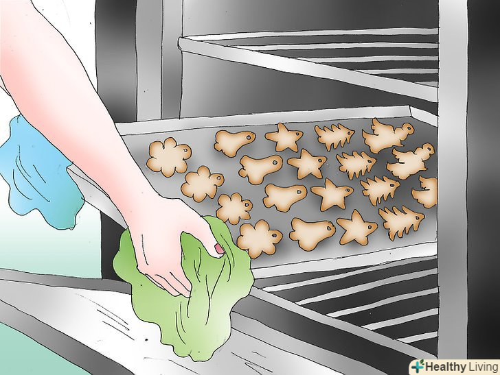 Почніть випікати прикраси. викладіть прикраси з солоного тіста на посипаному борошном деку. Поставте деко на середню полицю в духовці, попередньо нагрів її до 120 градусів. Готуйте дві години. Потім дістаньте солодощі з духовки, покладіть на спеціальну підставку і дайте їм повністю охолонути.
