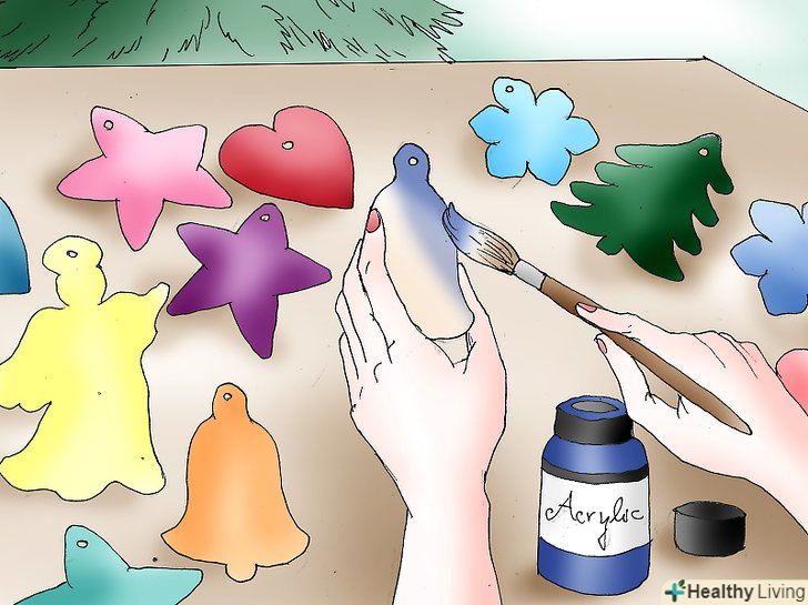 Займіться прикрасами. як тільки прикраси з тіста охолонуть, покрийте їх акриловими фарбами і клеєм з блискітками. Прикраса залежить від ваших особистих уподобань. Можна використовувати невеликий пензлик, щоб вималювати дрібні деталі, або просто пофарбувати прикрасу в один колір. Також, можна наклеїти блискітки, гудзики і стрази для додаткового декору.