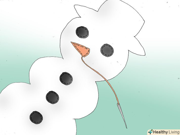 Пришийте очі, ніс і гудзики сніговика. Візьміть один з овалів і пришити до нього очі дрібними стібками. Потім пришити ніс-морквину і гудзики-вуглинки. Використовуйте нитку відповідного кольору. Наприклад, для носа потрібно використовувати нитку оранжевого кольору, а для інших частин сніговика використовуйте чорну нитку.