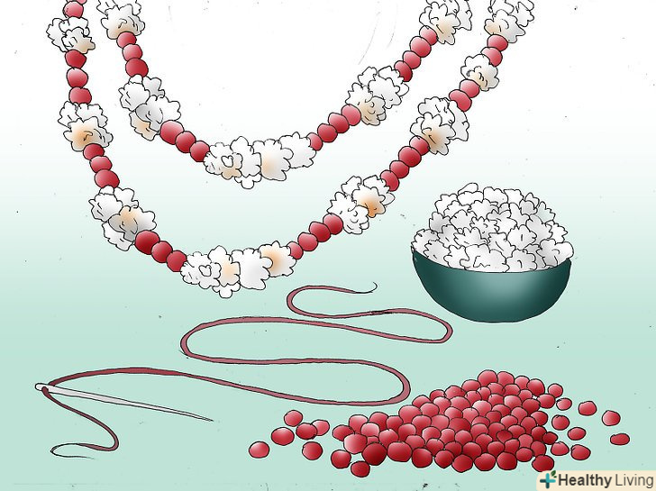 Зробіть гірлянду з попкорну і журавлини. візьміть голку, товсту нитку (з нейлону або м'якої бавовни), ємність з попкорном і чашку журавлини. Вставте нитку в голку і зробіть великий вузол на відстані шести дюймів від краю нитки. Почніть по черзі нанизувати попкорн і журавлину на нитку. Можна використовувати інший варіант гірлянди. Зав'яжіть великий вузол на кінці нитки. Повісьте гірлянду на домашнє Різдвяне дерево або на ялинку у дворі, щоб птахи могли поласувати смачним частуванням! [1]