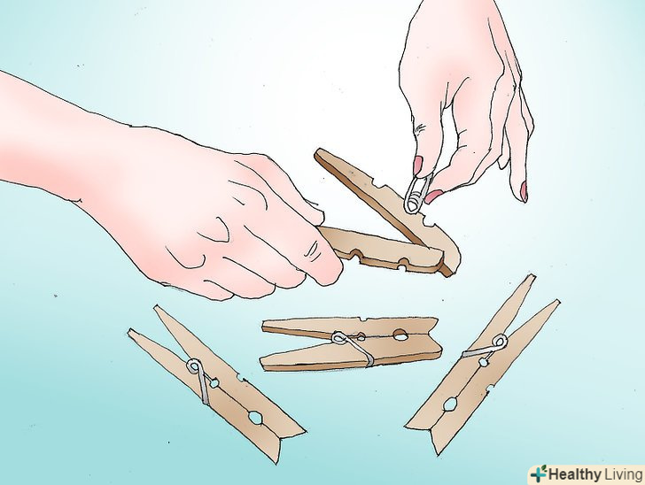 Візьміть вісім дерев'яних прищіпок. така кількість прищіпок необхідно для створення однієї сніжинки. Обережно розділіть кожну прищіпку і видаліть металеві вставки.