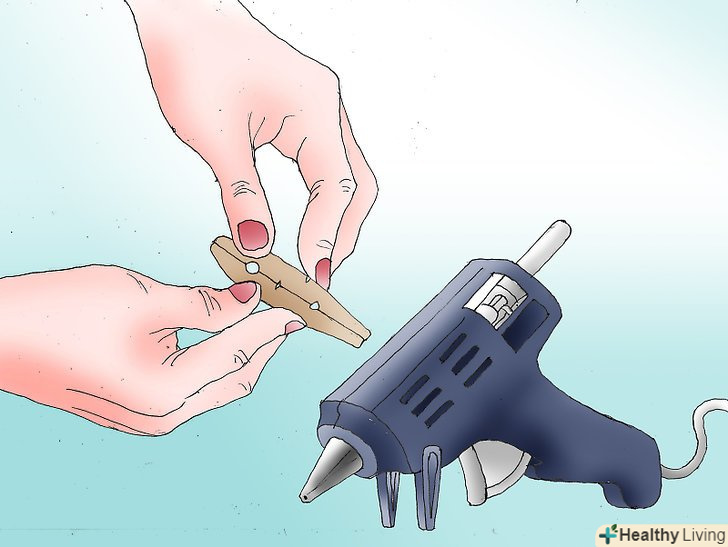 Склейте дві половинки прищіпки. Візьміть термоклей і склейте дві плоскі частини прищіпки. Візьміть шматочок стрічки, перегніть його навпіл і вставте кінці між дерев'яними смужками. Зробіть це до того, як їх склеїти. Пізніше ви зможете повісити прикрасу на ялинку.