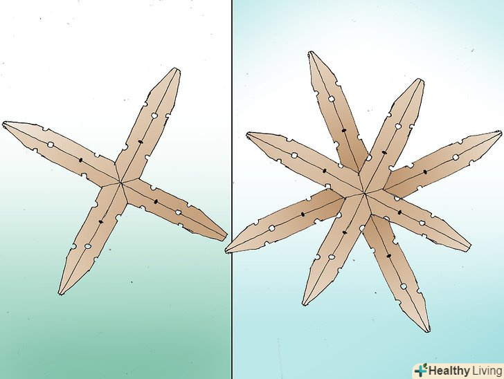 Зробіть сніжинку. зберіть її в такому порядку:- Візьміть дві склеєних складових і вирівняйте плоскі кінці під прямим кутом. Приробити ще дві частини, щоб отримати хрестоподібну форму.