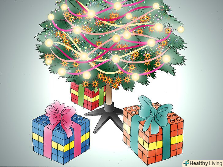 Зробіть подарунки з конструктора Лего. це дуже легко зробити дітям! Зберіть великі деталі конструктора, щоб зробити квадратну або прямокутну форму подарунка. Візьміть шматочок кольорової стрічки, обгорніть нею подарунок і зав'яжіть нагорі бантик. Поставте подарунок з конструктора Лего під ялинкою або повісьте його на різдвяне дерево!