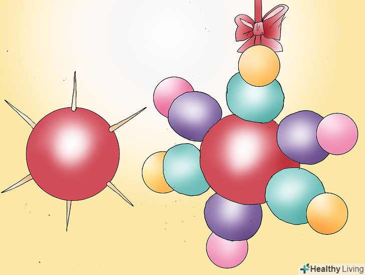 Зробіть сніжинку з чупа-чупса. Візьміть великий чупа-чупс і наклейте на нього шість зубочисток через рівні проміжки. Візьміть кілька невеликих чупа-чупсів і приклейте на них зубочистки. Чупа-чупс повинен бути повністю покритий зубочистками. Прикріпіть стрічку, щоб повісити прикрасу на різдвяне дерево, або підвісьте сніжинку з чупа-чупса на гілку. [2]