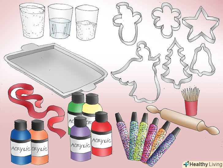 Приготуйте інгредієнти і необхідні матеріали. щоб зробити прикраси з солоного тіста, вам знадобиться чашка борошна, півчашки солі і півчашки води. Також вам знадобляться формочки для тіста на різдвяну тематику (зірочки, ялинки, ангели, Різдвяний вінок і т.д.), деко, качалка, кілька зубочисток, стрічка, акрилові фарби і клей з блискітками для декорування.