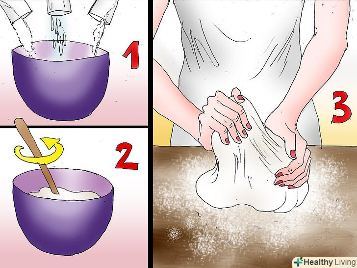 Приготуйте солоне тісто. візьміть велику миску, змішайте борошно, сіль і воду до густої консистенції. Розкладіть тісто на поверхні, посипаної борошном, і розкачайте, поки тісто не стане плоским. Якщо тісто занадто клейке, додайте в нього ще трохи борошна, але не перестарайтеся, інакше тісто буде розсипатися. [4]