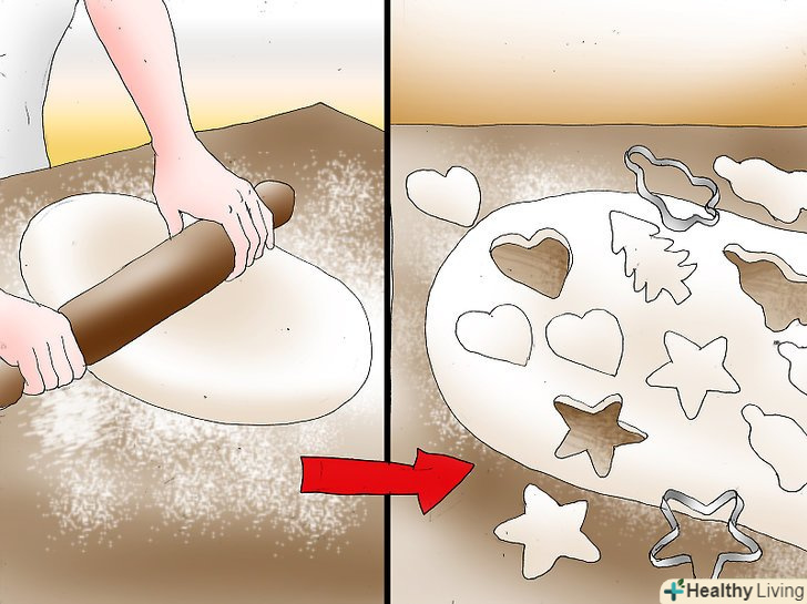 Використовуйте різні форми для випікання. посипте качалку борошном і розкачайте тісто, щоб його товщина дорівнювала 1/4 дюйма. Використовуйте тематичні Різдвяні форми для випікання, щоб зробити формове тісто. Прикладіть формочки на посипану борошном поверхню, щоб використовувати все тісто.