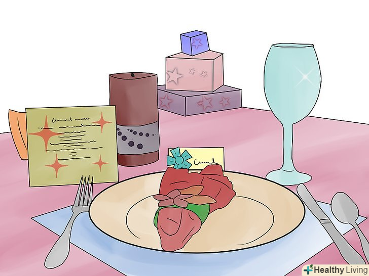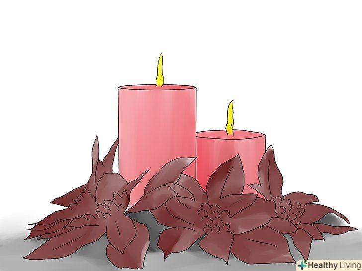 Прикрашений свічник. це дуже простий, швидкий і ефектний спосіб зробити стіл ошатніше. Спочатку поставте свічку в свічник, стаканчик або келих для вина відповідного розміру, а потім оберніть його посередині або навколо підстави чимось в святковому стилі. Це може бути Червона оксамитова стрічка з красивим бантом, смужка, вирізана з рукава старого светра, віночок з хвойних гілок.- Ви можете використовувати в якості свічників невеликі баночки для варення: це буде виглядати по-домашньому затишно.