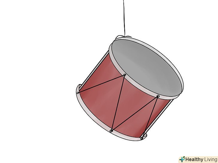 Саморобний барабан. маленькі барабани – одне з традиційних ялинкових прикрас. Роздобудьте маленькі круглі коробочки, розфарбуйте або обклейте декоративною стрічкою на свій смак і декорують по периметру блискучою крученою ниткою або вузькою стрічкою. Зробіть петлю зі стрічки, щоб вішати барабан на ялинку.- Зробіть кілька барабанів різного розміру та/або кольору, щоб влаштувати справжній парад!