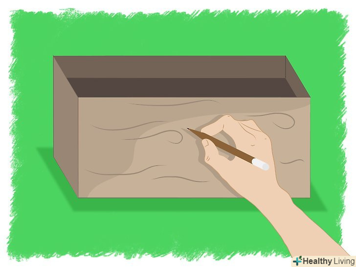 Намалюйте структуру дерева на зовнішній стороні коробки. використовуйте маркер, щоб намалювати текстуру дерева на зовнішній стороні коробки. Намалюйте злегка вигнуті лінії протягом всієї коробки, щоб створити імітацію дощок. Додайте деталі, які імітують вири дерева, його вузли і тріщини, щоб було схоже на дерево. Намалюйте імітацію цвяхів в кожному кутку коробки, це буде останнім штрихом.- Якщо ви використовуєте картон, на якому надрукований малюнок, покрийте його спочатку коричневої обгорткового папером або обрізаними паперовими пакетами. Використовуйте двосторонній скотч або клей, щоб приклеїти коричневий папір до коробки і повністю прибрати малюнок внизу. Коли клей висохне, маркером намалюйте малюнок, що імітує структуру дерева.