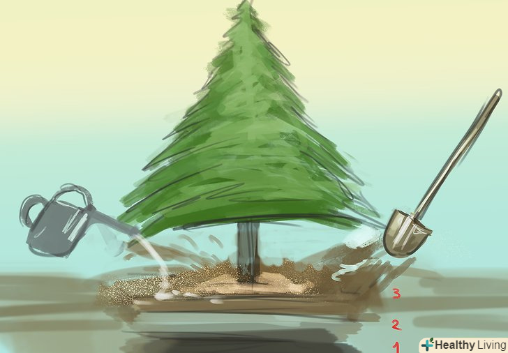 Коли ви готові садити дерево, переконайтеся, що воно посаджено на таку ж глибину, на якій воно було вирощено. після того, як ви помістили дерево в яму, зніміть весь пластик і брезент. Якщо дерево було вирощено в контейнері, переконайтеся, що ви роз'єднали зовнішні корені і відрізали зламані. Також розправте коріння так, щоб вони росли у напрямку від дерева. Заповніть яму грунтом, яку ви зберігали і гарненько утрамбуйте. Використовуйте залишився грунт для формування 7,5-10 см виступу навколо дерева. Цей виступ допоможе ретельно поливати коріння. Розрівняйте цей виступ навесні. Збризкуйте дерево анти-зневоднюючим засобом, дотримуючись інструкцій на упаковці.- Якщо можливо, і земля навколо дерева замерзає, мульчуйте дерево 5-7,5 см хорошою мульчі. Слідкуйте за тим, щоб дерево було добре полито, особливо під час посух. З правильним доглядом, ваша ялинка стане цінним доповненням вашого пейзажу. [3]