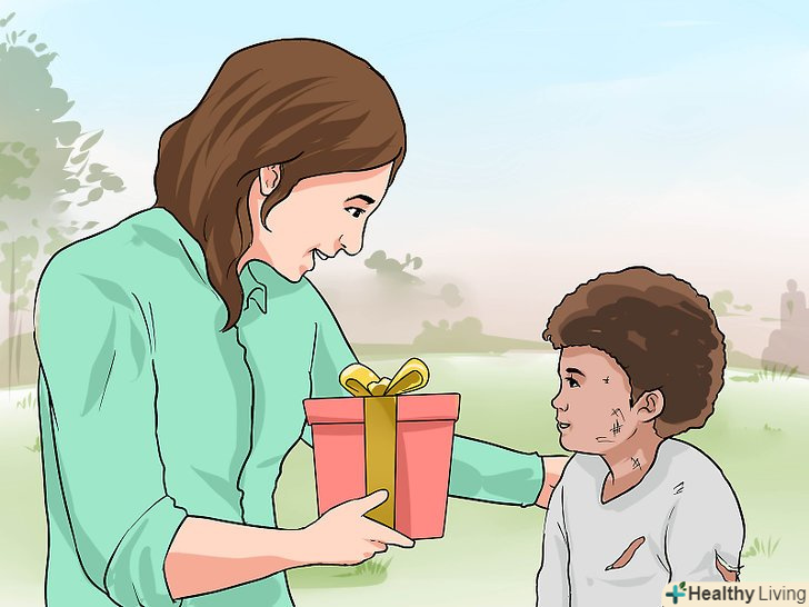 Придбайте подарунки на благодійному ярмарку. у передсвяткові дні багато благодійних організацій проводять ярмарки або аукціони на користь своїх підопічних. На них можна купити найрізноманітніші подарунки, від домашнього варення і теплих рукавиць до оригінальних фотографій і акварелей. Так ви не тільки порадуєте близьку людину унікальною, але і зробите добру справу.- Купіть подарунок тому, хто цього потребує. Якщо ви знаєте нужденну людину особисто, зробіть подарунок безпосередньо; якщо ні, знайдіть благодійну організацію, яка цим займається, і передайте подарунок, наприклад, в будинок престарілих або притулок для бездомних.
