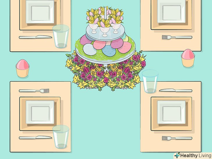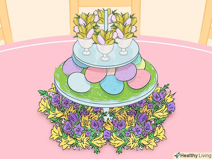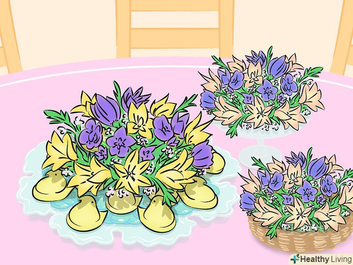 Прикрасьте стіл квітами. квіти-завжди безпрограшна Прикраса столу, а весна — саме час порадувати себе тюльпанами або нарцисами. Ви можете просто поставити їх у вазу або аранжувати більш оригінальним чином для досягнення особливого ефекту. Ось кілька ідей на замітку:- Знайдіть скляну вазу. Покладіть в неї скляні камінчики відповідних для Великодня відтінків-наприклад, пастельних відтінків блакитного, рожевого, зеленого (або, якщо вам так більше подобається, візьміть безбарвні). Потім поставте букет квітів. Додайте води і поставте вазу на стіл. (Замість камінчиків можна взяти цукерки-драже, але в цьому випадку воду наливати не можна. В такому випадку поставте квіти відразу перед тим, як сідати за стіл, а після закінчення обіду поверніть їх в звичайну вазу або банку з водою).