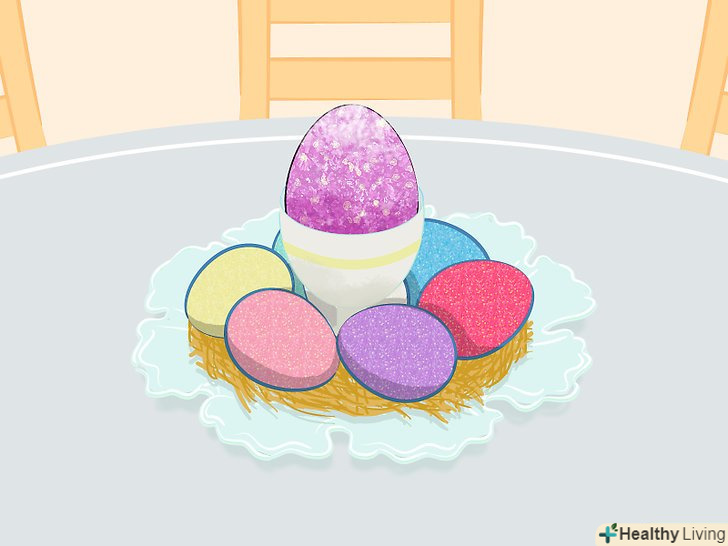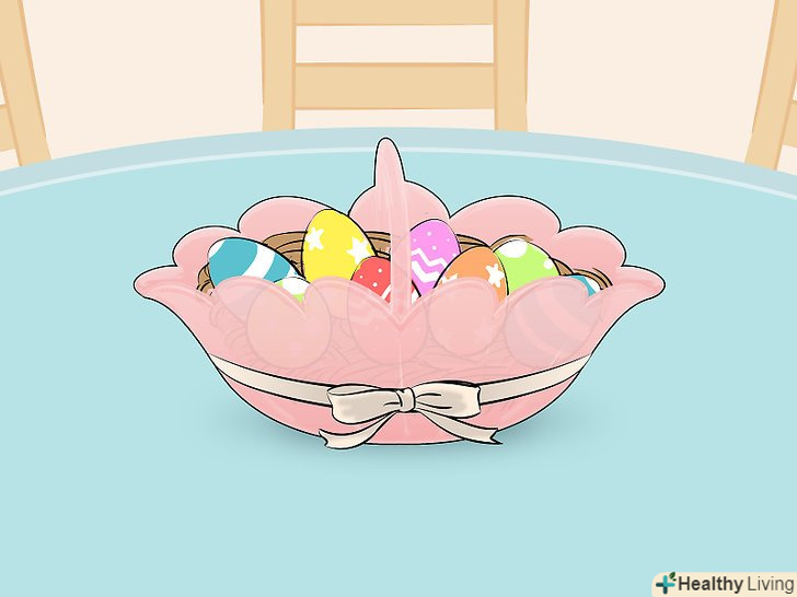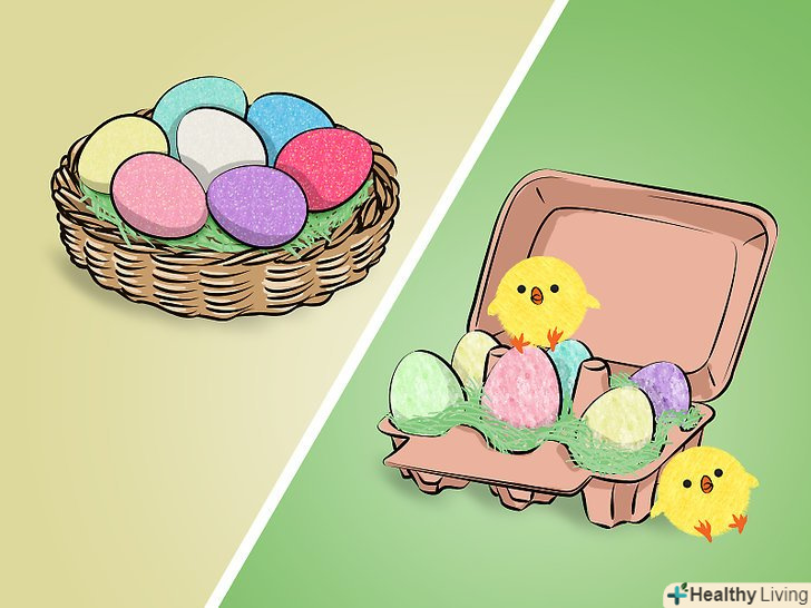 Зробіть прикраса з кошика або картонної коробки для яєць. Якщо у вас є красива кошик або акуратна картонка для яєць, вийде проста і мила композиція.- Якщо ви берете кошик, все що від вас вимагається, — це лише розкласти в ній яйця, а потім поставити її в центр святкового столу.