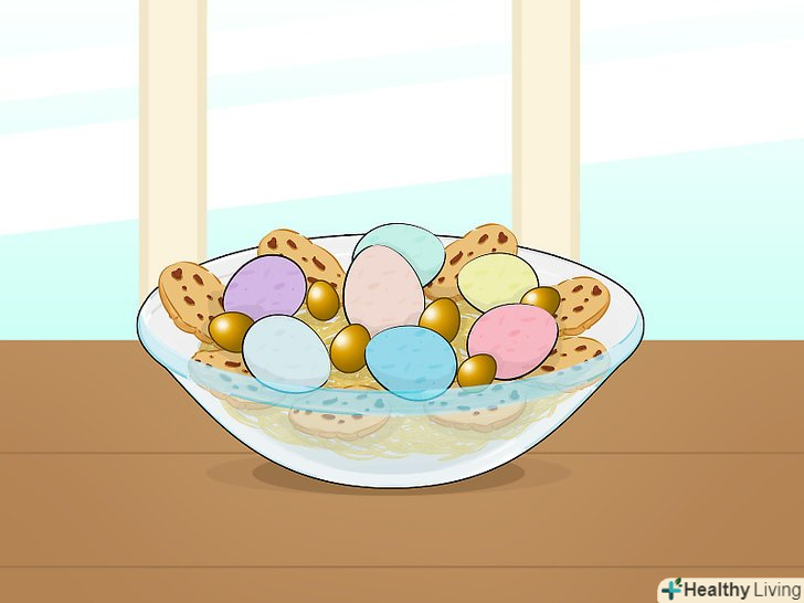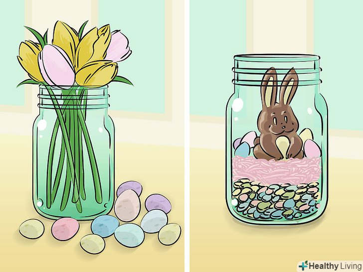 Використовуйте скляну банку. як і миска, прозора скляна банка може послужити основою для самих різних композицій. Поставте в банку букет весняних квітів і розкладіть яйця навколо або спробуйте одну з наступних ідей:- Покладіть на дно банки зелену травичку і посадіть на неї шоколадного зайця. Навіть без будь-яких додаткових прикрас вийде чудова композиція.