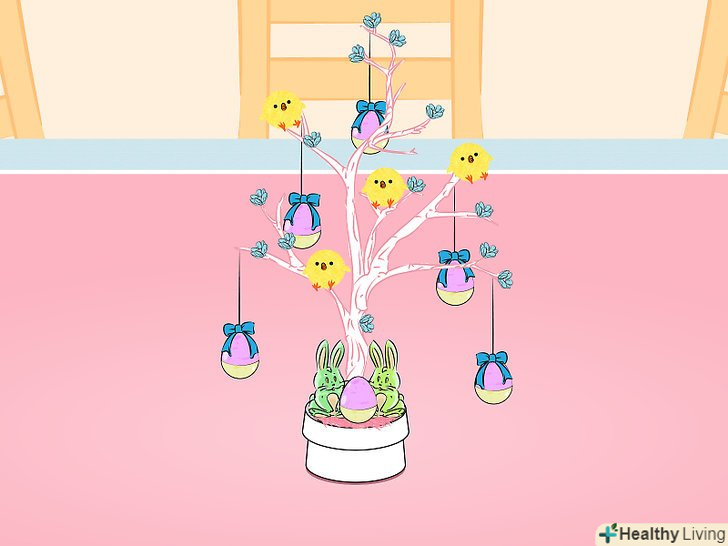 Зробіть пасхальне дерево з відповідної гілки. візьміть суху, але міцну гілку, схожу за формою на деревце. Можете залишити її як є або пофарбувати в білий колір або в пастельний відтінок, що поєднується з сервіруванням або іншими прикрасами. Прикрасьте дерево пасхальними фігурками і міцно встановіть його в стійкий контейнер. Поставте на середину столу.- Зробіть розкішне пасхальне дерево. Нарядите його безліччю мініатюрних зайчиків, курчат і яєць. Підвісьте прикраси на стрічках, як новорічні кулі.