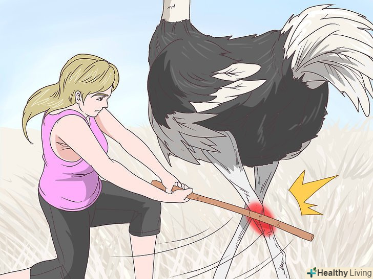 Дістаньтеся до ніг птаха. якщо ви опинитеся позаду страуса або збоку від нього, спробуйте вдарити його по ніг. Пам'ятайте, що страус утримує рівновагу лише завдяки двом тонким ногам. [18] якщо вам випаде така можливість, вдарте страуса по одній з них або обом, щоб порушити його рівновагу і не дати атакувати вас.