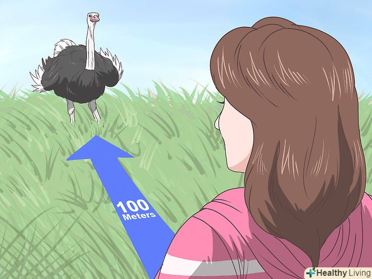 Уникайте близького контакту. якщо ви помітите страусів в дикій природі, тримайтеся від них подалі. Не підходьте до птахів занадто близько (ближче ніж на 100 метрів). Якщо до вас наближається страус, відступите, навіть якщо птах поводиться спокійно. Ніколи не ставте страуса в безвихідне становище, інакше він спробує атакувати замість того, щоб відступити. [20] [21]- Ймовірно, фотографії людей, які гладять, цілують страусів і навіть їздять на них створюють враження, що ці птахи нешкідливі, проте врахуйте, що подібні фотографії зроблені з прирученими страусами на фермах. Навіть з такими страусами слід дотримуватися обережності, не кажучи вже про їх диких родичів.