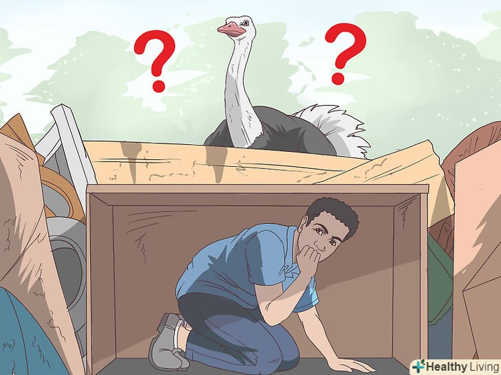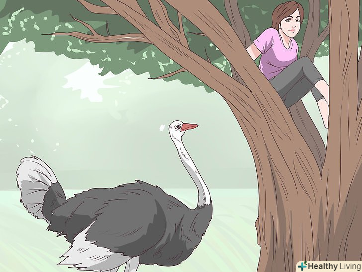 Заберіться вище. Пам'ятайте про те, що страуси не здатні літати. [8] якщо вам не вдасться знайти укриття на землі, заберіться на дерево, паркан або інше піднесення. [9] перш ніж спускатися, дочекайтеся, поки страус забуде про вас і відійде подалі.- Дорослі страуси досягають у висоту 2-3 метрів. Хоча у страусів немає зубів, вони можуть вдарити дзьобом і збити вас на землю. Заберіться вище, щоб птах не могла дотягнутися до вас.