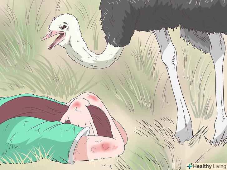 Ляжте на землю. Не біжіть до укриття або піднесеного місця, якщо воно розташоване занадто далеко від вас. Замість цього вдайтеся до крайней мере і Прикиньтеся мертвим. Ляжте животом на землю і прикрийте потилицю руками, щоб захистити голову. Страус може підійти і помацати, вдарити або наступити на вас. Зачекайте, поки йому це набридне і він відійде від вас. Врахуйте, що даний спосіб може привести до травм. [11]- Ризик травми від удару страусиної лапи набагато зменшується, коли людина лежить. Страус б'є вперед і вниз, причому найбільше зусилля він прикладає при русі лапи вперед.