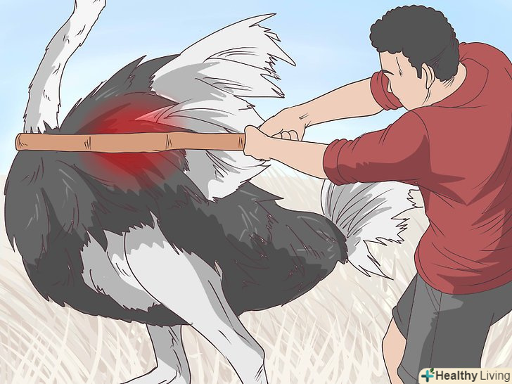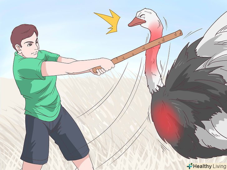 Використовуйте щось довге. якщо вам доводиться захищатися від страуса, уникайте близького контакту. Намагайтеся триматися якнайдалі від його ніг. Скористайтеся в якості зброї будь-яким довгим підручним предметом: палицею, граблями, шваброю або жердиною. [13]- Якщо у вас є вогнепальна зброя і вам доводиться використовувати його, цільтеся в тулуб птиці — це найбільша і зручна мішень. Хоча страус завдає ударів ногами і дзьобом, його кінцівки і шия занадто тонкі, і ви легко можете промахнутися.
