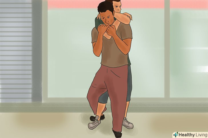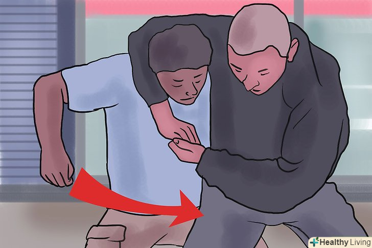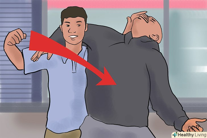 Встаньте на повний зріст і атакуйте. у той час як однією рукою ви відштовхуєте голову нападника назад, випрямляйте спину, щоб поставити його в ще більш невигідне положення (спина противника вигнеться назад). Рукою, якою ви тримали нападника за руку, задушливу вас, нанесіть йому ще удар по ребрах або паху, а потім відштовхніть від себе подалі. [5]- Така тактика дасть вам час на те, щоб втекти.