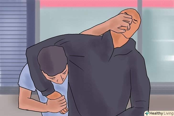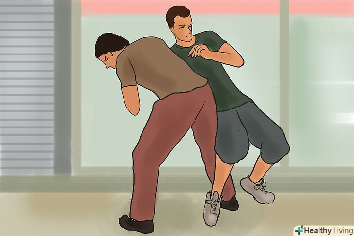 Оглушіть нападника. за допомогою руки, яка знаходиться ближче до передньої частини тіла атакуючого, вдарте по його паху, якщо це чоловік. Також можна постаратися вдарити нападника в живіт або по ребрах ліктем. Як для чоловіка, так і для жінки удар по ребрах або в живіт буде однаково болючим.- Постарайтеся, щоб ваша рука залишалася вільною, оскільки нею ви можете наносити удари по паху противника або захистити своє обличчя і голову, якщо противник спробує вас вдарити. [2]