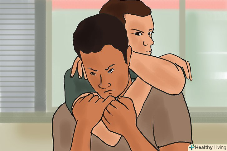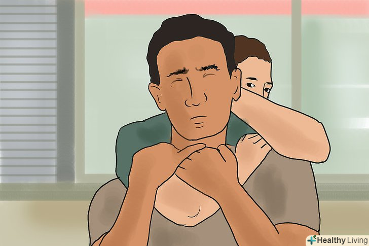 Спробуйте дотягнутися до голови нападника. спробуйте просунути руку, яка знаходиться за спиною нападника, між своїм і його тілом, а потім дотягніться їй до обличчя противника. Якщо ситуація критична, пальцями спробуйте натиснути на очі нападника або дотягнутися до його носа або підборіддя, щоб відсунути його голову назад. [3] Тримайте другу руку на руці або кисті нападника, яка тримає вас за шию.- Тіло піде за головою. Ось чому, виштовхуючи голову противника назад, ви змусите його втратити рівновагу. [4]