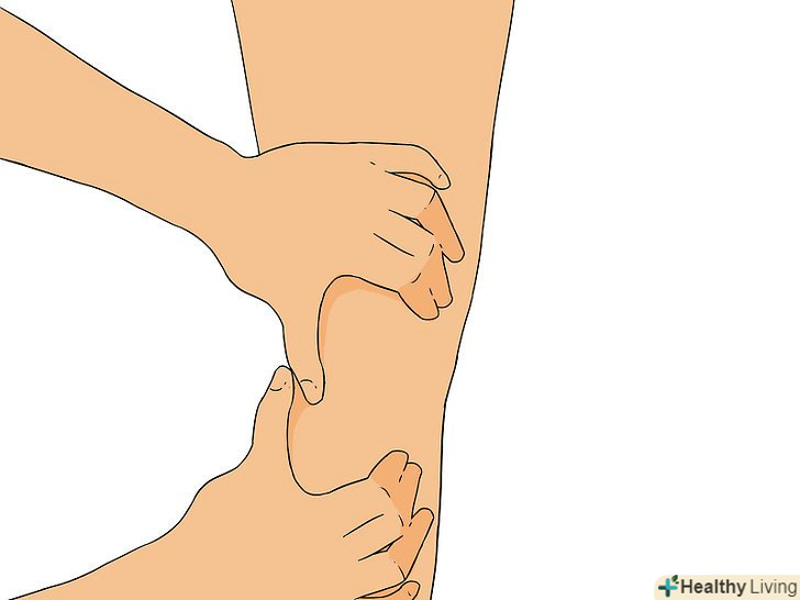 Натисніть на ікру великими пальцями. покладіть обидві руки на ікру, щоб великі пальці опинилися посередині ікри, один на іншому. Натискаючи, проведіть великими пальцями вгору по ікрі, намагаючись тримати пальці посередині, в «пазі». [10]- Уздовж задньої сторони ікри насправді проходить одна м'яз, литковий, але у неї дві головки. Це означає, що між ними є «паз» для великих пальців.