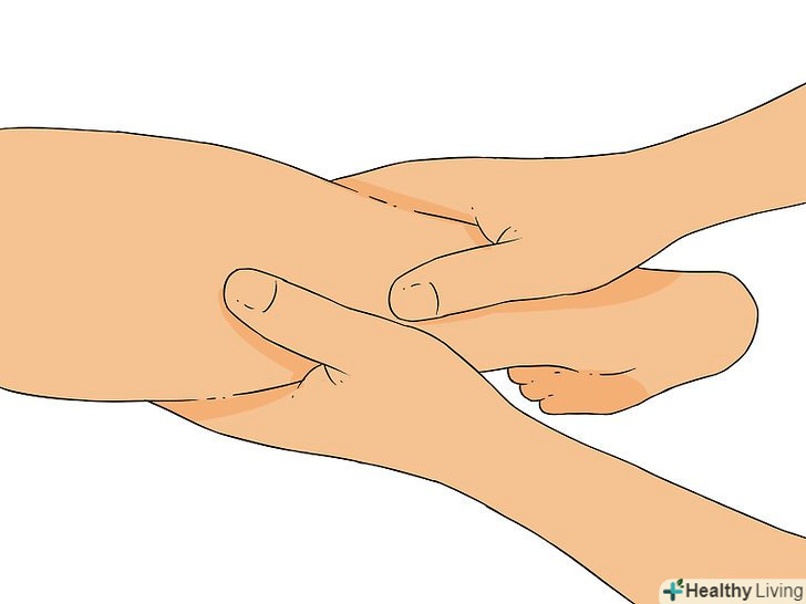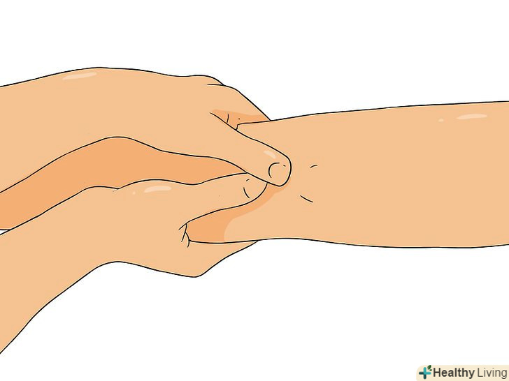 Пальцями проведіть вгору по передпліччя. Візьміть передпліччя рукою, щоб великий палець виявився з одного боку, а інші пальці — з іншого (всередині/зовні), і натисніть з обох сторін. Пересувайте свою руку вгору по руці до ліктя. [12]- Можна також використовувати обидва великих пальця на верхній частині передпліччя. Тримайте великі пальці по одній лінії, а не поруч один з одним. Натискаючи, проведіть пальцями до середини передпліччя.