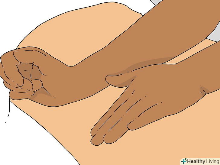 Натисніть на передпліччя нижньою частиною долоні. людина лежить на спині. Нижньою частиною долоні почніть масаж біля ліктя і рухайтеся до плеча. Використовуйте вагу тіла, щоб створити тиск. [11]- Також для цього можна використовувати кісточки пальців. Використовуйте невеликі кругові рухи.