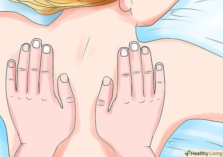 Масажуйте спину, шию і плечі:- Покладіть одну руку поверх іншої і водите круговими рухами навколо лопаток. Дотики повинні бути ніжними і повільними, масажуйте верхівки плечей, навколо шиї і підставу черепа, подушечками пальців.