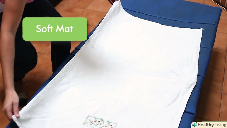 Покладіть м'який мат. Якщо вам недоступний масажний стіл, і ви вибираєте одну з твердих альтернатив, то постеліть м'який мат. Використовуйте той, товщина якого становить, принаймні, 5 сантиметрів, щоб забезпечити належний комфорт людині, якій ви робите масаж. [3]