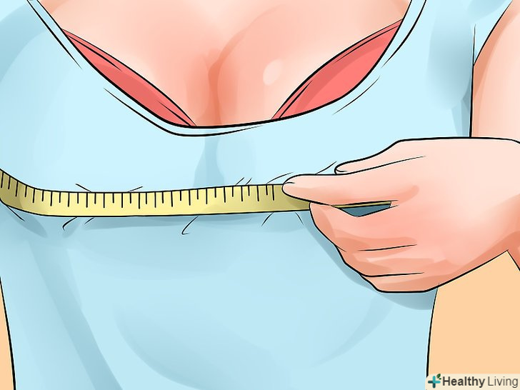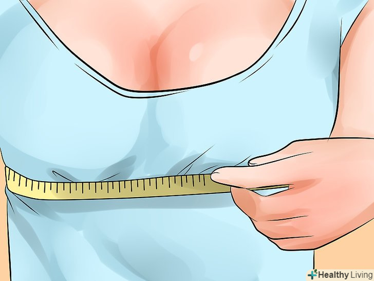 Визначте розмір стрічки бюстгальтера. щоб визначити розмір стрічки необхідного вам бюстгальтера, спочатку потрібно за допомогою сантиметрової стрічки виміряти обхват торса безпосередньо під грудьми. Округліть отримане значення до найближчого числа, кратного п'яти. [2]- Якщо в результаті вимірювань обхват під грудьми виявився на пару сантиметрів більше числа, кратного п'яти, то обхват необхідно зменшити до цього числа. Наприклад, якщо обхват під грудьми дорівнює 82 см, то необхідний Вам розмір стрічки бюстгальтера становить 80 см.
