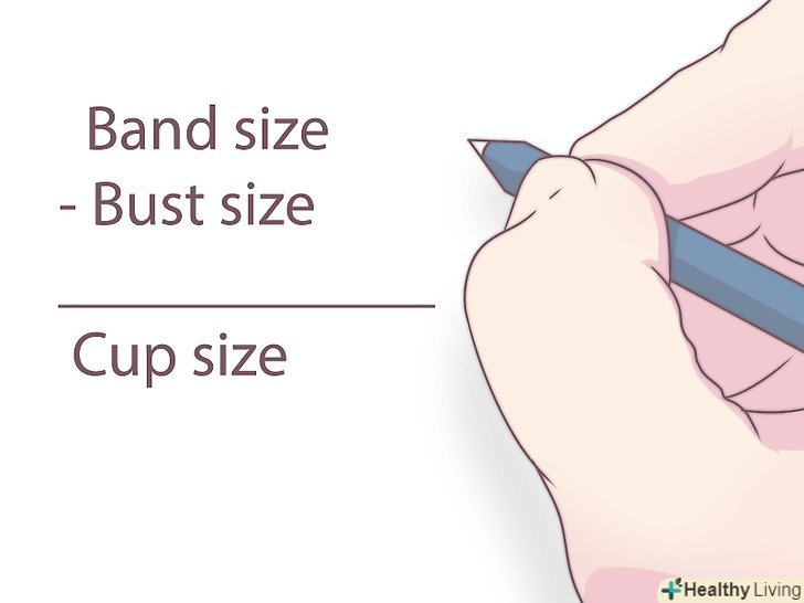 Визначте ваш розмір чашки. щоб визначити розмір чашки, потрібно відняти дані обхвату над грудьми від даних обхвату грудей.- Різниця в сантиметрах і визначить ваш розмір чашки. 1 буде чашка А, 2-чашка В і так далі.