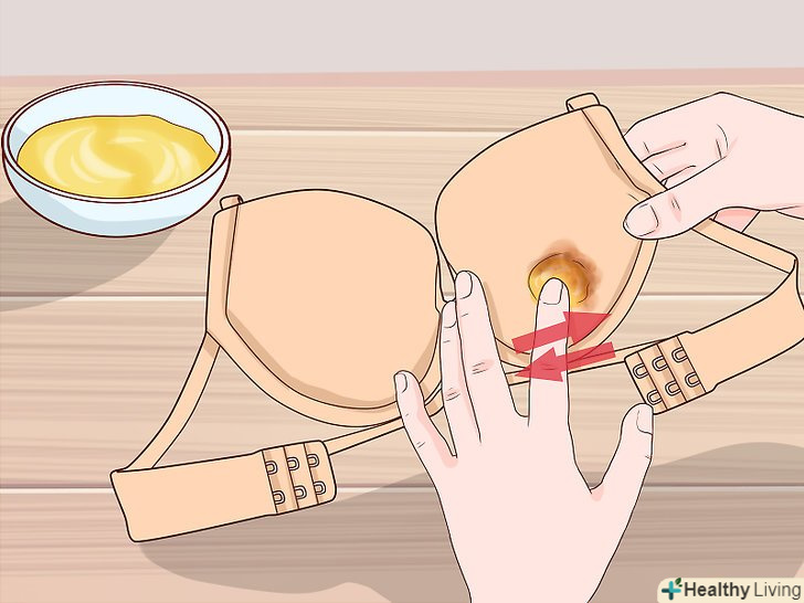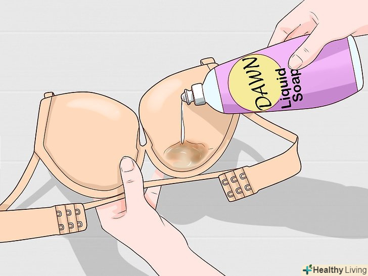 Налийте невелику кількість рідкого засобу для миття посуду на пляму. можна використовувати засоби для миття посуду будь-яких марок: Fairy, AOS, міф і так далі.- Використовуйте цей метод тільки для білих бюстгальтерів. Відбілюючі речовини в миючому засобі можуть змивати колір, тому цей метод не підходить для кольорових або мають візерунок бюстгальтерів. [18]