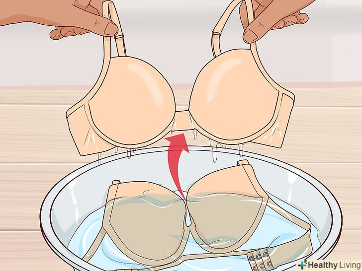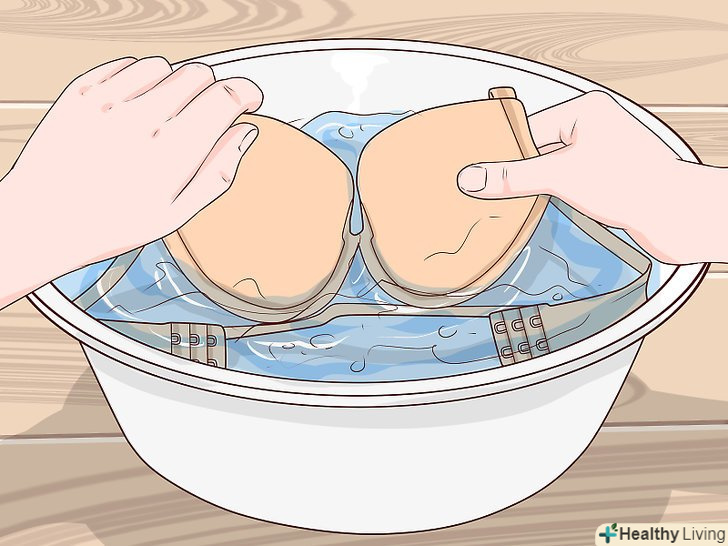 Виперіть бюстгальтер в холодній воді. можете додати невелику кількість прального порошку, щоб видалити залишки засобу для миття посуду. Можете випрати бюстгальтер двічі, щоб бути абсолютно впевненими, що ви повністю змили пральний порошок і засіб для миття посуду. [19] Пам'ятайте, що бюстгальтери не можна віджимати, замість цього слід просто обережно стиснути, щоб прибрати надлишки води. Можна загорнути бюстгальтер в чистий рушник-цим Ви теж видаліть зайву воду. [20]