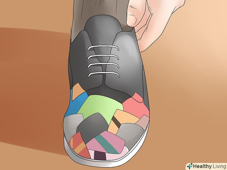 Негайно приклейте шматочок паперу. помістіть обраний вами шматочок паперу на покритий пастою ділянку взуття. [3]- Акуратно притисніть папір пальцями, поки вона не приклеїться.