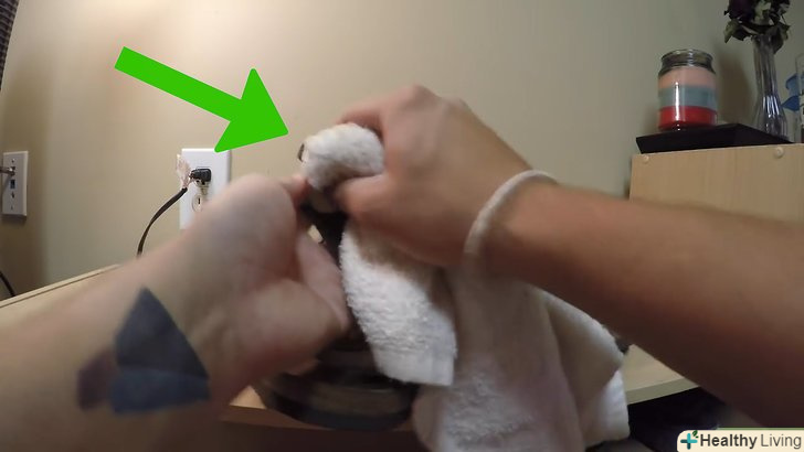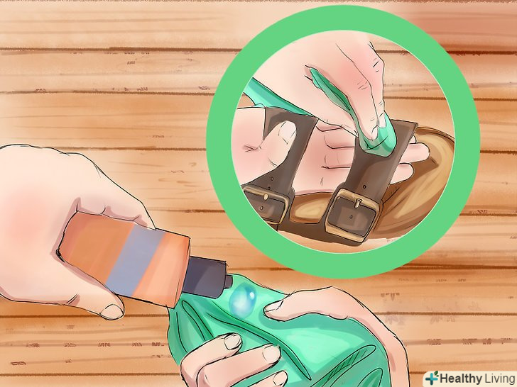 - Натріть поверхню взуття. відрізком тканини тріть поверхню взуття круговими рухами. Злегка змочіть ганчірку водою перед обробкою, якщо ви працюєте з блискучою шкірою.