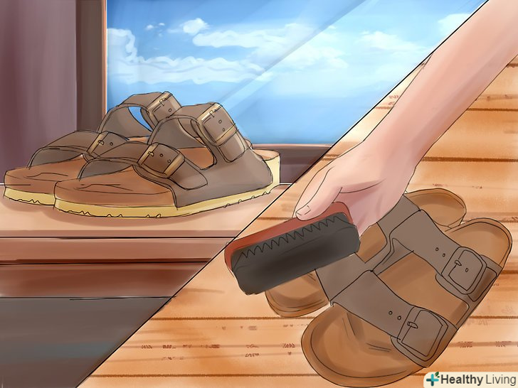 Спочатку необхідно видалити все сміття. візьміть щітку для замші і очистіть біркенштоки від залишків бруду. Щітка для замші також допомагає видалити будь-яку бруд, яка прилипла до підошви взуття. [1]