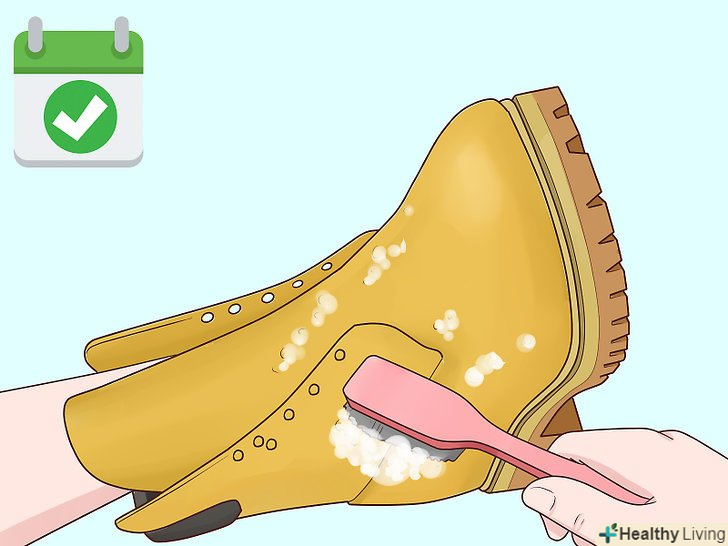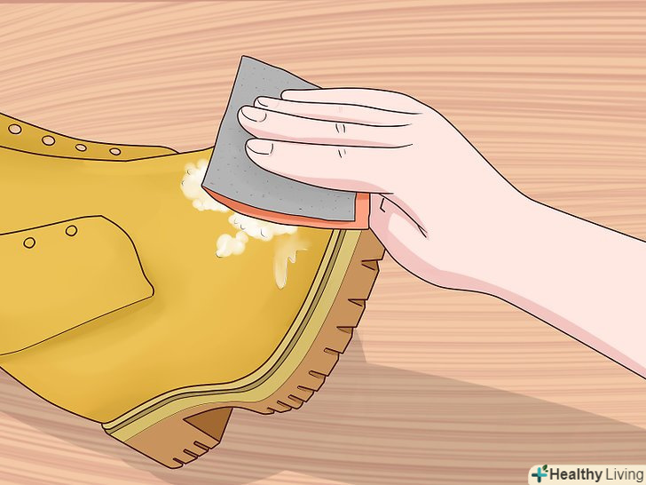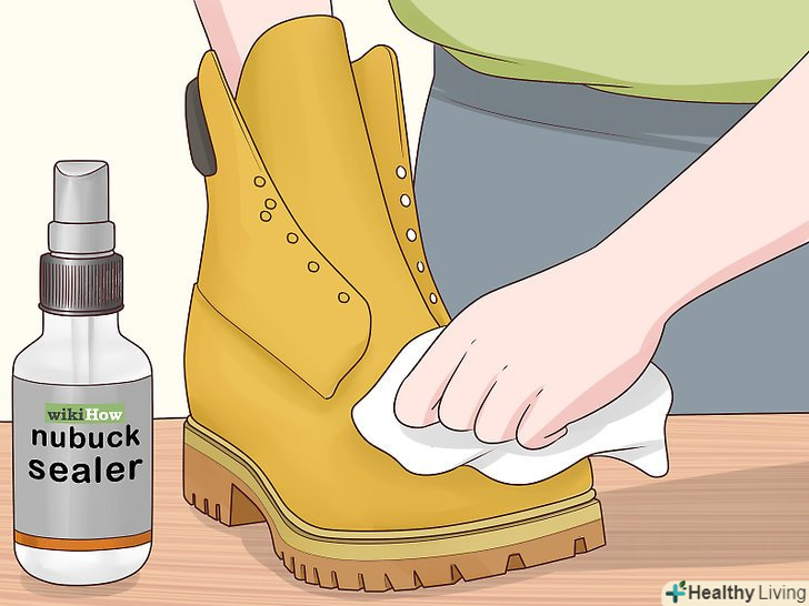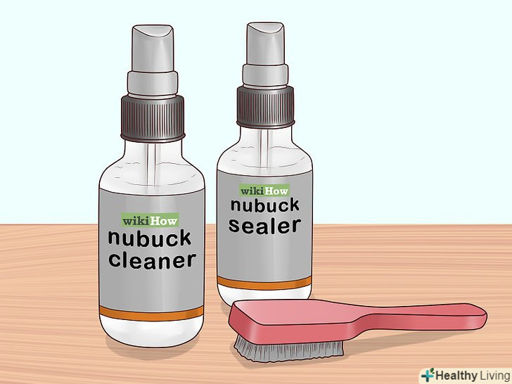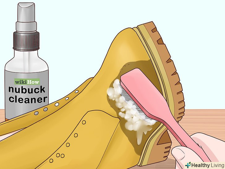 Купуйте чистячі та водовідштовхувальні засоби, призначені спеціально для вашого взуття. засоби, які ви придбаєте, повинні відповідати матеріалу, з якого виготовлені черевики. У виробництві черевиків Timberland нерідко використовуються замша і шкіра, а традиційні черевики Timberland роблять з нубуку. Замшу і нубук зазвичай чистять одними і тими ж засобами. [6]- Купуйте чистячі засоби, які підходять для кольору вашого взуття. Уважно ознайомтеся з інформацією на упаковці миючого засобу, щоб переконатися в тому, що їм можна обробляти жовтий нубук, з якого зазвичай роблять класичні черевики Timberland.