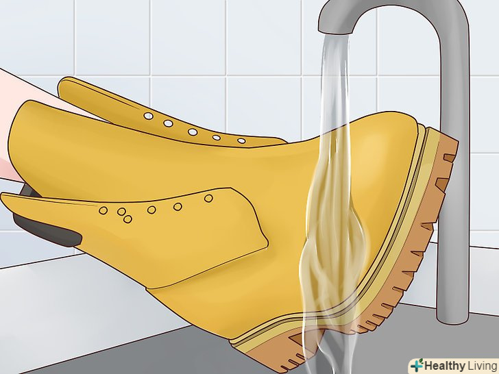 Сполосніть поверхню черевик невеликою кількістю води. Коли будете задоволені тим, як відмиті черевики, сполосніть їх зовнішню поверхню. Використовуйте невелику кількість води, щоб прибрати з черевиків залишкові сліди миючого засобу і бруду.